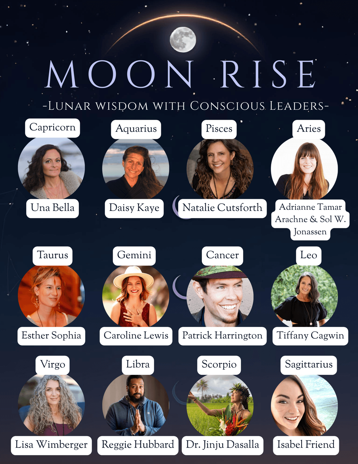 Moon Rise weaves together the twelve zodiac signs with twelve visionary facilitators, creating a year-long journey of lunar wisdom, embodiment, and insight.